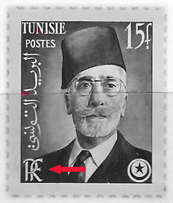 Le 25 juillet 1955, avant l'application effective des accords, un premier timbre à l'effigie du Bey est émis sans les lettres "RF".