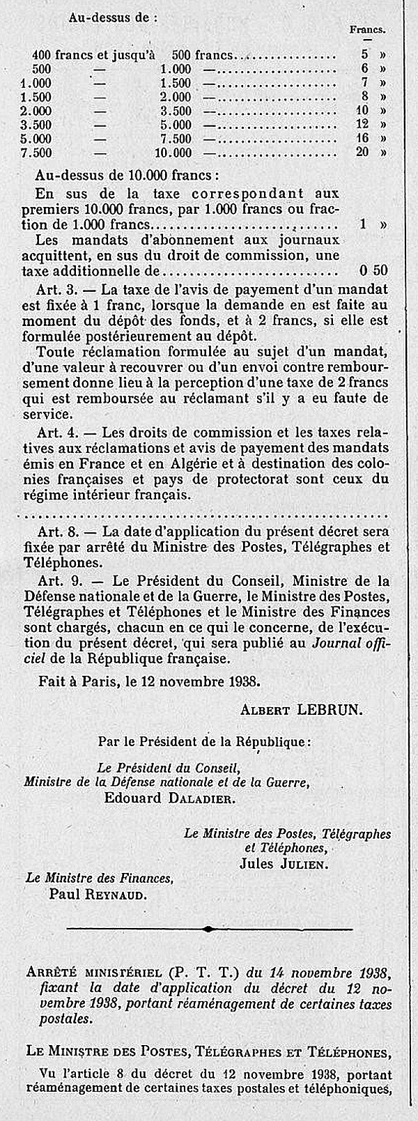 TARIFS POSTAUX DU 1ER DÉCEMBRE 1939