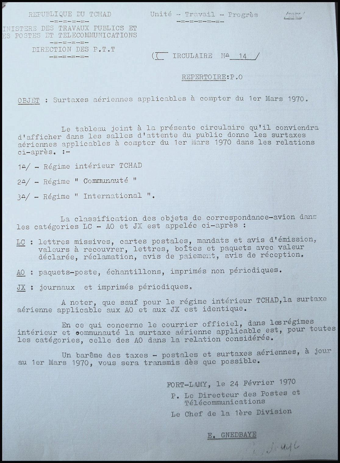Surtaxes aériennes au départ du Tchad à compter du 1er mars 1970 page 1 CLIQUER SUR L'IMAGE POUR AGRANDIR |