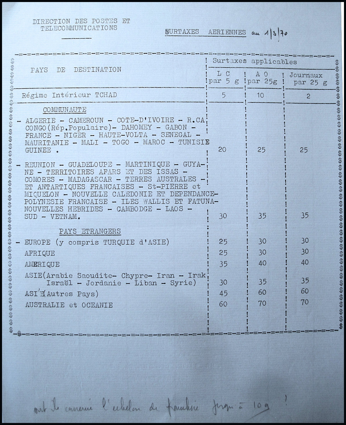 Surtaxes postales aériennes au départ du Tchad à compter du 1er mars 1970